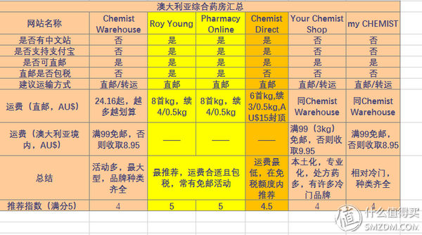 本文将对澳大利亚和新西兰一共十家常用综合药房做出汇总对比,这十个综合药房类购物网站均可直邮,包括Chemist Warehouse、Roy Young、Pharmacy Online、Chemist Direct、Your Chemist Shop、Your Chemist Shop六家澳大利亚购物网站以及HealthPost、Netpharmacy、KIWI Discovery、Pharmacy Direct四家新西兰购物网站,内容包括值得买的产品,购物攻略,运输方式,是否包税等各方面,在新税改后的危险期,希望能对各位值友有所帮助。
