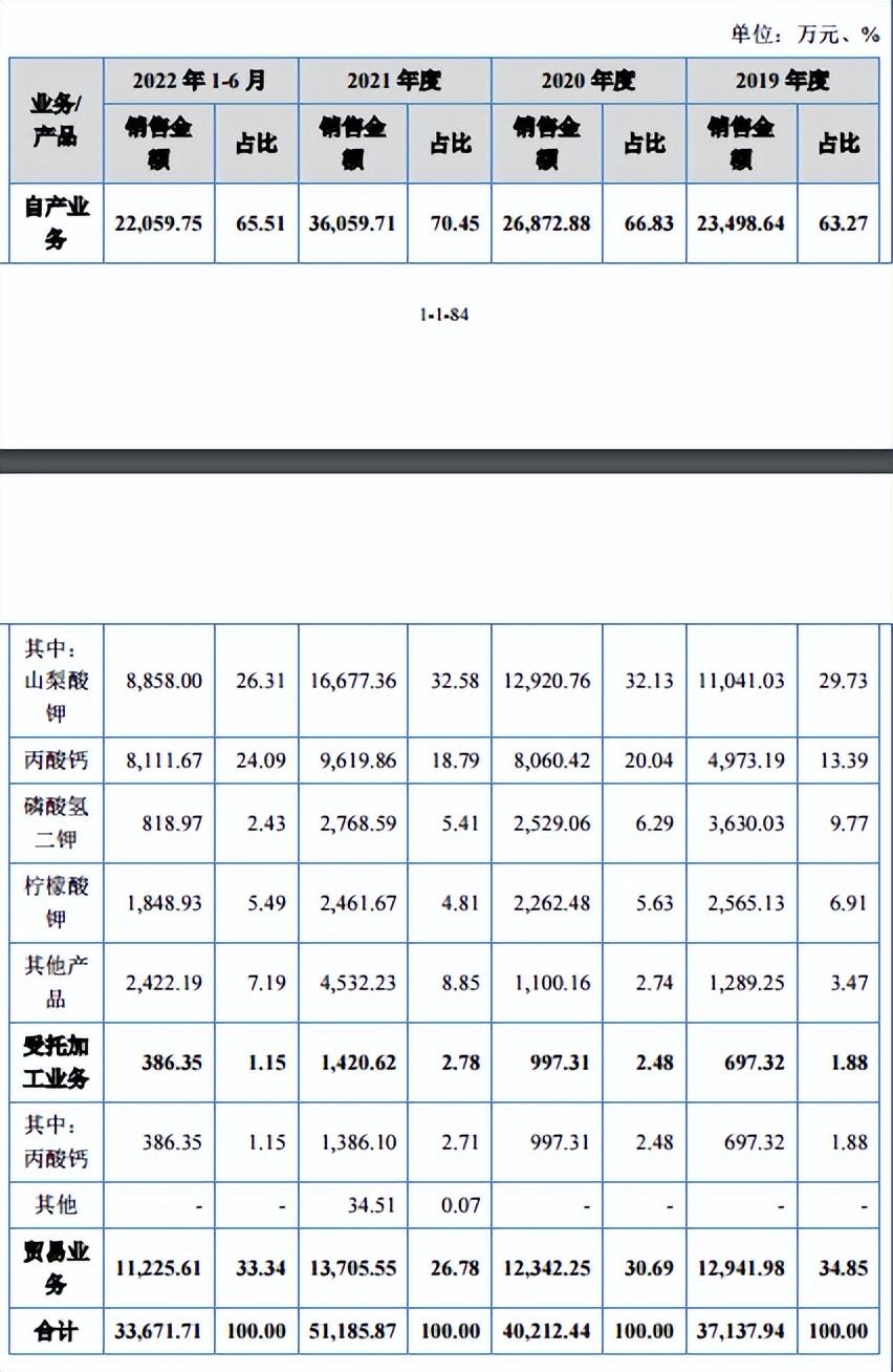 报告期各期,公司主营业务收入分别为 37,137.94 万元、40,212.44 万元、51,185.87 万元 和 33,671.71 万元。主营业务收入以自产业务收入为主,其中 2019-2021 年自产业务收入占比逐年上升,2022 年 1-6 月,自产业务收入占比有所下降,主要原因系贸易业务涉及的磷酸盐产品价格涨幅较大,贸易业务收入金额增幅大于自产业务收入增幅,自产业务收入占比被 动下降。主营业务收入的具体构成情况如下: