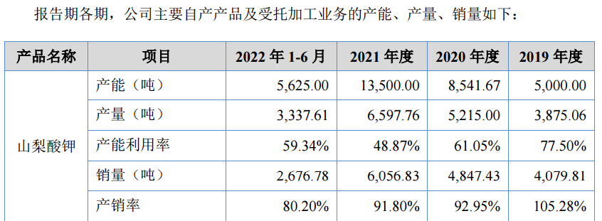 2020 年 9 月,公司 8,500 吨/年山梨酸钾生产线和 6,500 吨/年山梨酸生产线投产;2021 年 8 月,公司 13,000 吨/年丙酸钙生产线投产,随着产能增加,山梨酸钾和丙酸钙的产量和 销量也逐年增加。