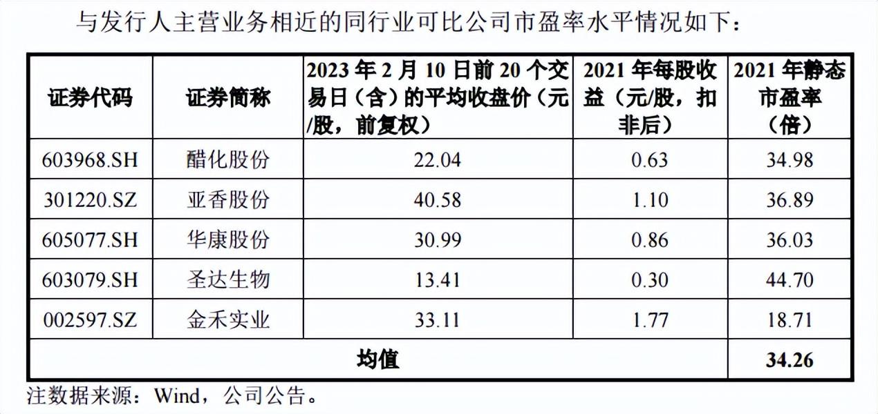 公司所属行业为食品制造业(行业代码:C14),行业最近一个月平均静态市盈率为 32.88 倍。上述同行业可比公司2021年静态市盈率均值为34.26倍。