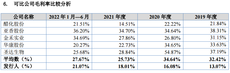 (1)业务结构不同。2019 年至 2021 年,公司贸易业务收入占比较高。同行业可比公司中,仅有醋化股份和金禾实业存在少量贸易业务。2020年、2021年,醋化股份贸易业务收入占主营业务收入的比例分别为11.03% 和 12.47%。金禾实业贸易业务收入占主营业务收入的比例分别为 1.49%、1.91%,占比较低。 2019 年至 2021 年,公司贸易业务收入占主营业收入比例分别为 34.85%、30.69%、26.78%,拉 低了主营业务收入的整体毛利率。
